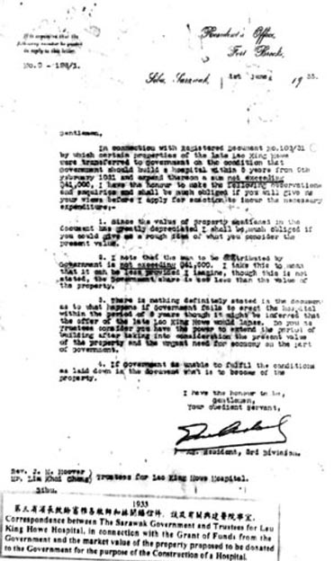 Correspondence between Sarawak Government and Trustees for Lau King Howe Hospital.